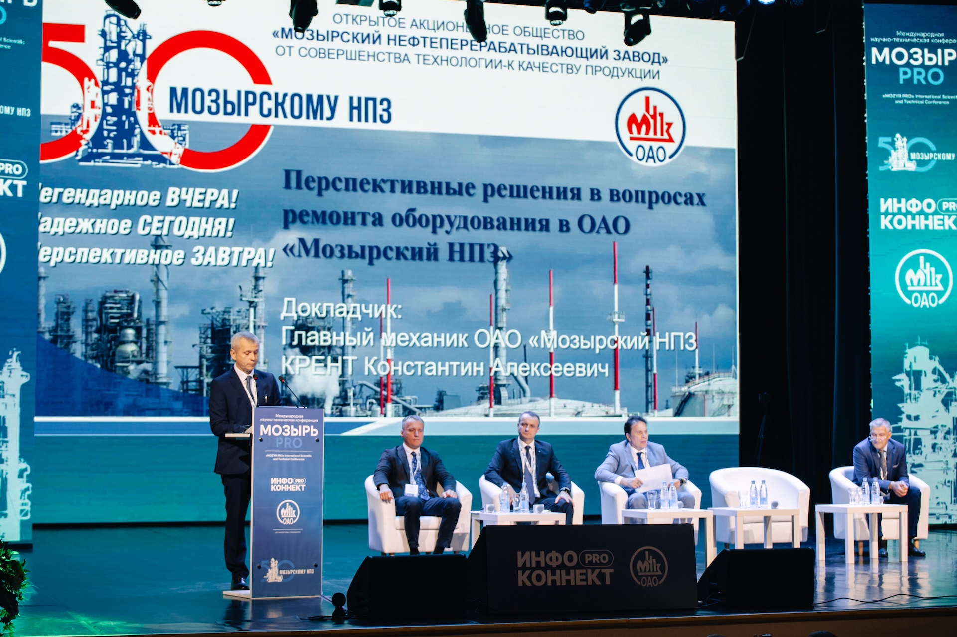 Мозырский НПЗ совместно с ИНФОКОННЕКТ ПРО провели 4-ую Международную научно-техническую конференцию «Развитие нефтеперерабатывающих и нефтехимических производств» (Мозырь PRO). В мероприятии приняло участие более 250 специалистов из Беларуси, Казахстана, России, Китая и других стран. В этом году конференция прошла в особенной торжественной обстановке, поскольку была приурочена к важному событию в жизни завода — к 50-летнему юбилею со дня выпуска первой товарной продукции Мозырским НПЗ. Поздравить юбиляров приехали, как поставщики, так и представители других нефтяных и химических компаний. Подарки, преподнесённые заводу, вскоре будут представлены в музее Мозырского НПЗ.